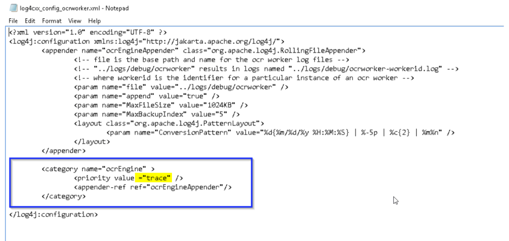 Ocr sunucu üzerinde log4cxx_config_ocrworker.xml dosyasını bulup notepad yardımıyla açıyoruz.