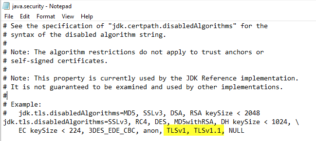 Java.security dosyasında, “jdk.tls.disabledAlgorithms” satırına TLSv1, TLSv1.1 ekleyin.
