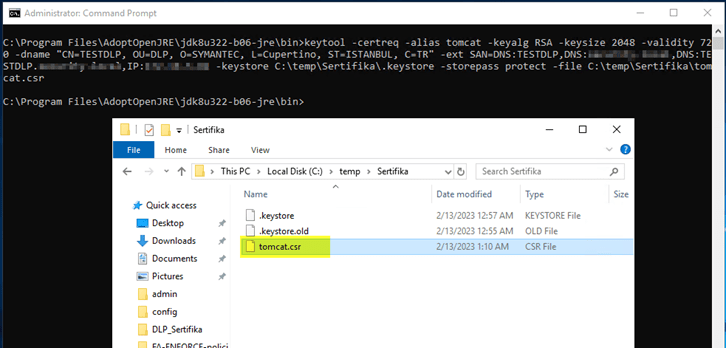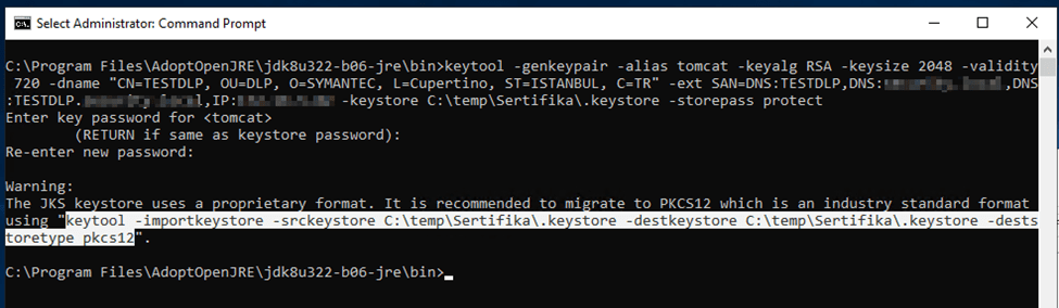 <DRIVE>:\Program Files\AdoptOpenJRE\jdk8u<version>-jre\bin\keytool -genkeypair -alias tomcat -keyalg RSA -keysize 2048 -validity 720 -dname “CN=<servername>, OU=DLP, O=SYMANTEC, L=Cupertino, ST=California, C=US” -ext SAN=DNS:<servername>,DNS:<domainname>,DNS:<FQDN>,IP:<IPAddress> -keystore <DRIVE>:\EnforceCert\.keystore -storepass protect