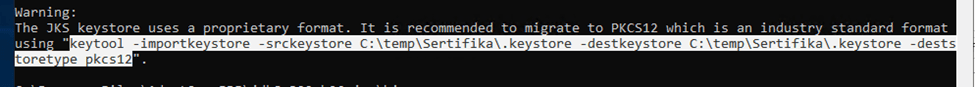 Komut çalıştırıldıktan sonra işaretlediğim alandaki komutu tekrardan çalıştırılarak keystore pkcs12 geçiş yapılır. Oluşturduğu ilk keystore dosyasını “.old” yaparak yeni keystore oluşturur.
