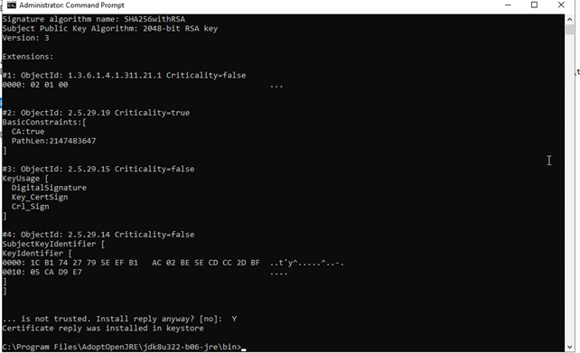 <DRIVE>:\Program Files\AdoptOpenJRE\jdk8u<version>-jre\bin\keytool -importcert -alias tomcat -keystore <DRIVE>:\temp\Sertifika\.keystore -trustcacerts -file <DRIVE>:\temp\Sertifika\certnew.p7b