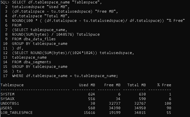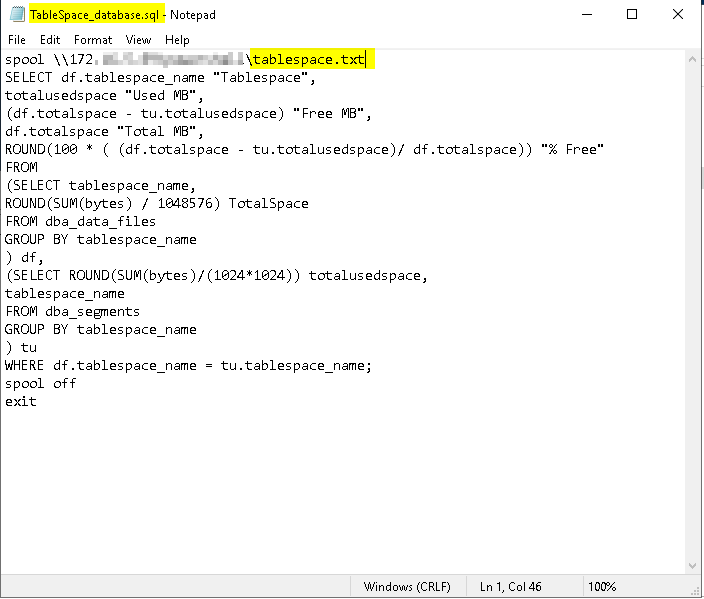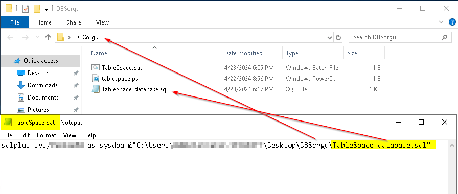sqlplus sys/Password as sysdba @”C:\Users\Username\Desktop\DBSorgu\TableSpace_database.sql”