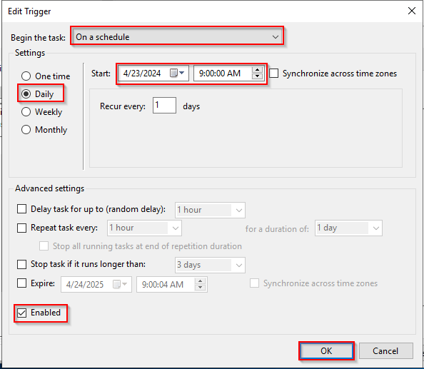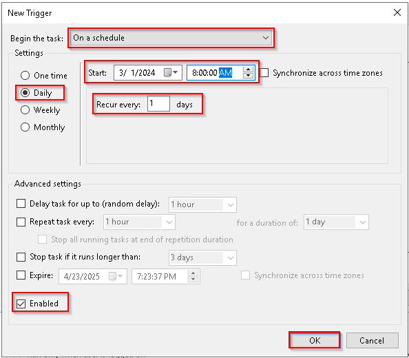 Select the “On a schedule” option, then choose “Daily” from the left side. Enter the desired time for the task to run, and ensure that the “Enable” option for the created trigger is selected.