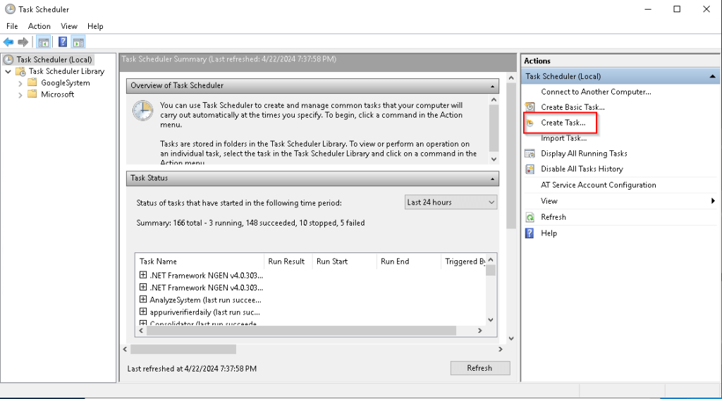 Click on the “Create Task” option and enter a name and description for the new task. Check the “Run with highest privileges” box to run the program with administrator privileges.