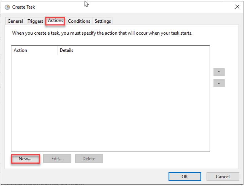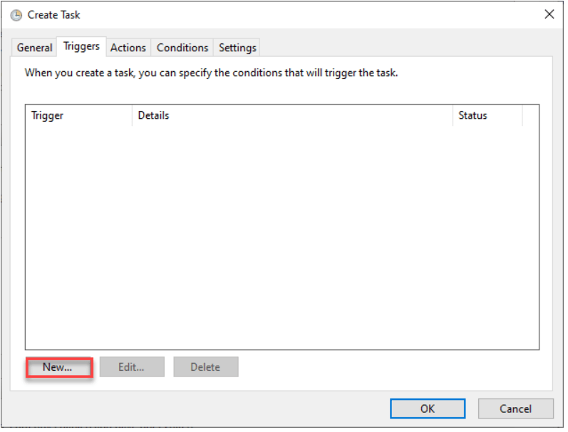 Next, switch to the Triggers tab and click on the “New…” button. Here, you can define the conditions that trigger the task to be executed.