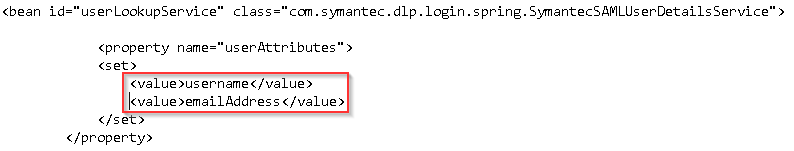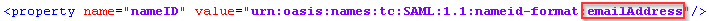 Set the property value of “nameID” by editing the property name =”nameID” value in the Spring file to a name identifier such as emailAddress, WindowsDomainQualifiedName, or another nameID that your IdP supports. Here’s an example for email address:
